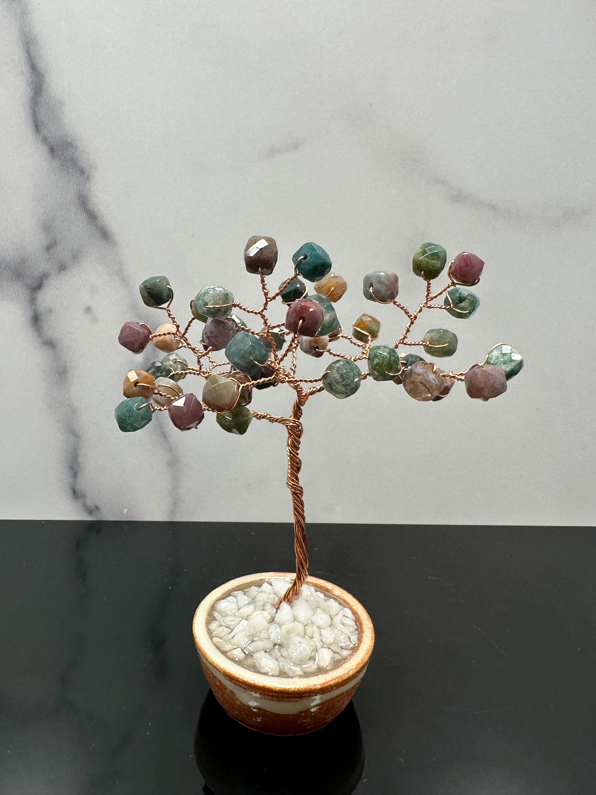 Bring harmony and grounding energy into your space with this handcrafted Indian Agate crystal gem tree. Each branch is carefully twisted with gemstone beads and rooted in a one-of-a-kind handmade ceramic base, crafted by Zack of Zack’s Ceramic Creations. Our connection at a local farmers market sparked this collaboration, blending his ceramics with my crystal gem trees to create a piece that is both meaningful and truly unique.