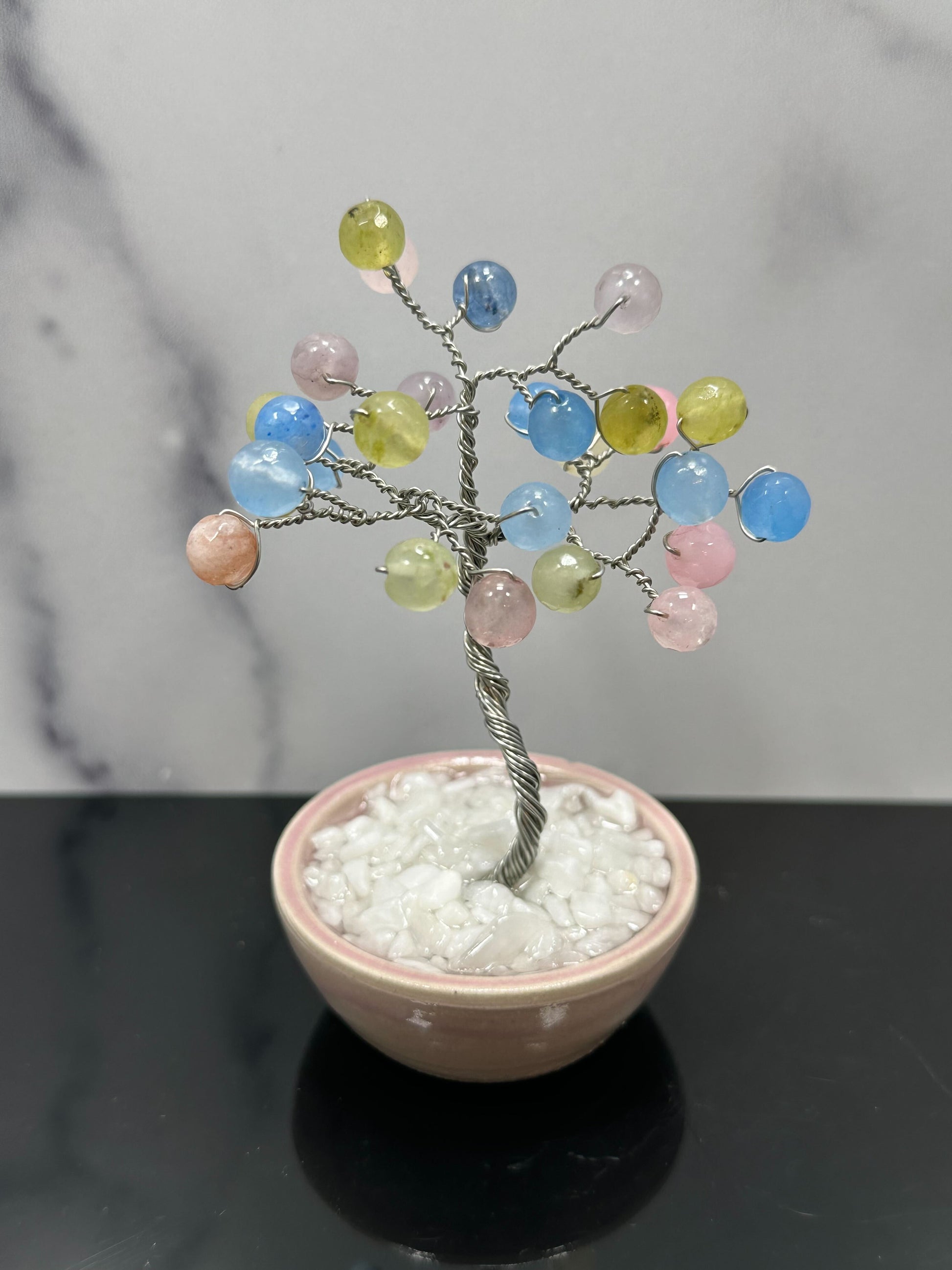 Bring harmony and grounding energy into your space with this handcrafted Pastel Rainbow Agate crystal gem tree. Each branch is carefully twisted with gemstone beads and rooted in a one-of-a-kind handmade ceramic base, crafted by Zack of Zack’s Ceramic Creations. Our connection at a local farmers market sparked this collaboration, blending his ceramics with my crystal gem trees to create a piece that is both meaningful and truly unique.